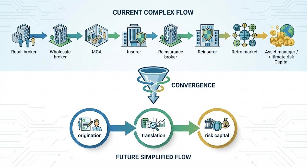 Historically, insurance has been somewhat of a relay race. Retail brokers hand off to wholesale brokers, to MGAs, to carriers, to reinsurers, to retro markets, and eventually to asset managers, who are the ultimate destination for risk capital. Each handoff adds time and cost.